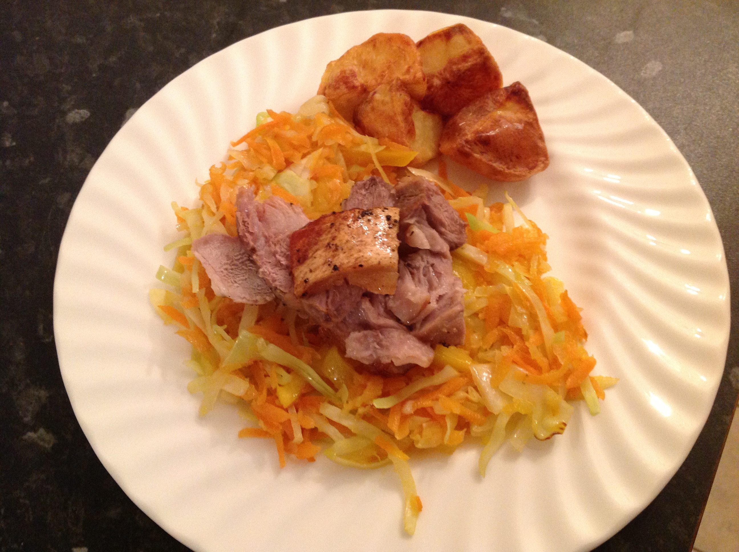 Anyway, I’m rambling and need to get back on track. Tonight, dinner was a lovely pork joint with crackling, a few roasted potatoes, and my new creation, Stir Fry Coleslaw, or SFC for short. Its not really coleslaw, but it is the main vegetables you would find in coleslaw, the carrots, onions and cabbage, then rather than covered with mayonnaise or salad cream, I stir fried them. I guess its not a new invention, I would imagine that for many people this is just stir fry, but for me, it made me chuckle!