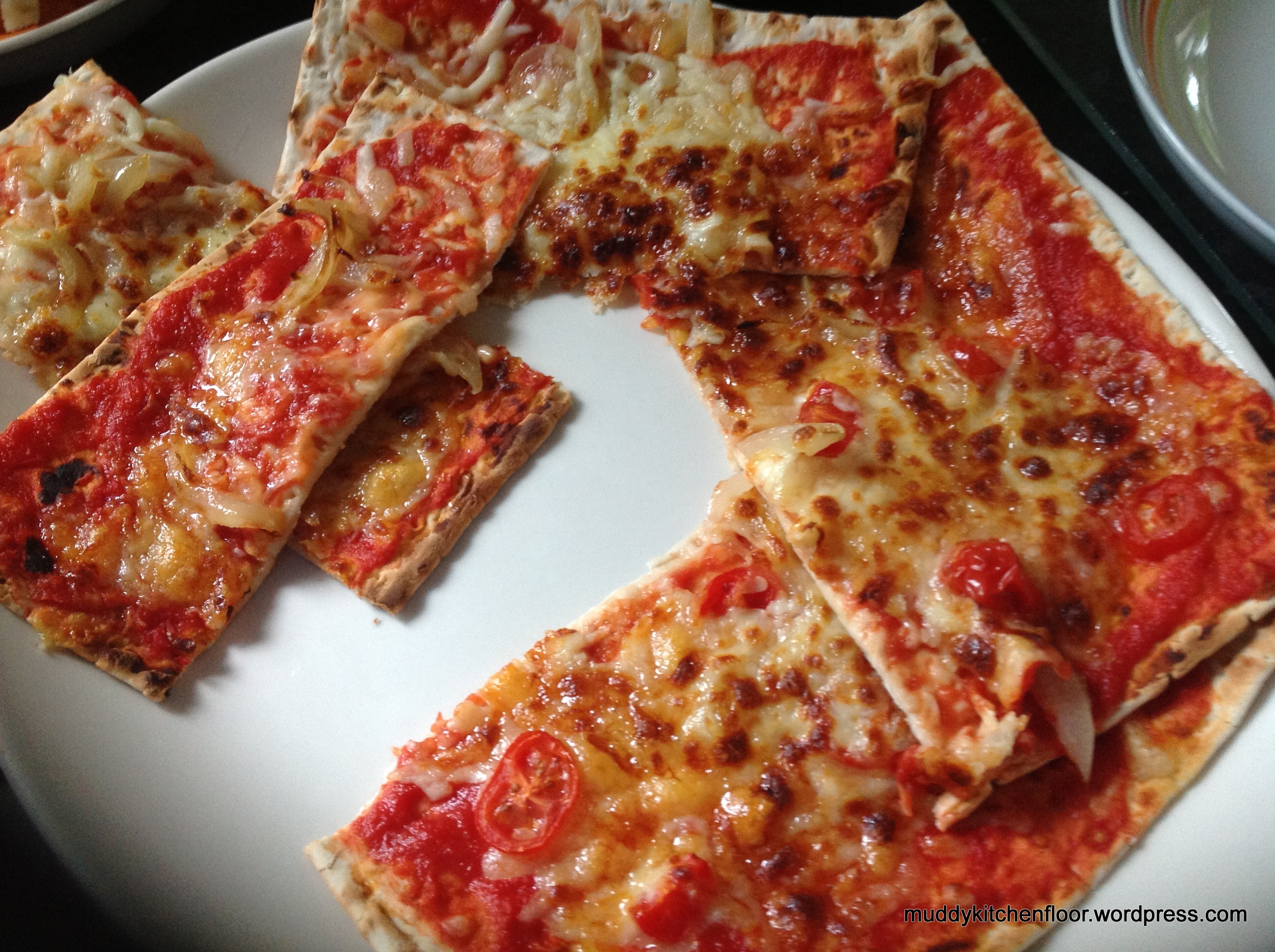 This was then placed under a hot grill until the cheese had melted, and browned slightly. A very tasty pizza treat for some guests which had turned up unexpectedly!