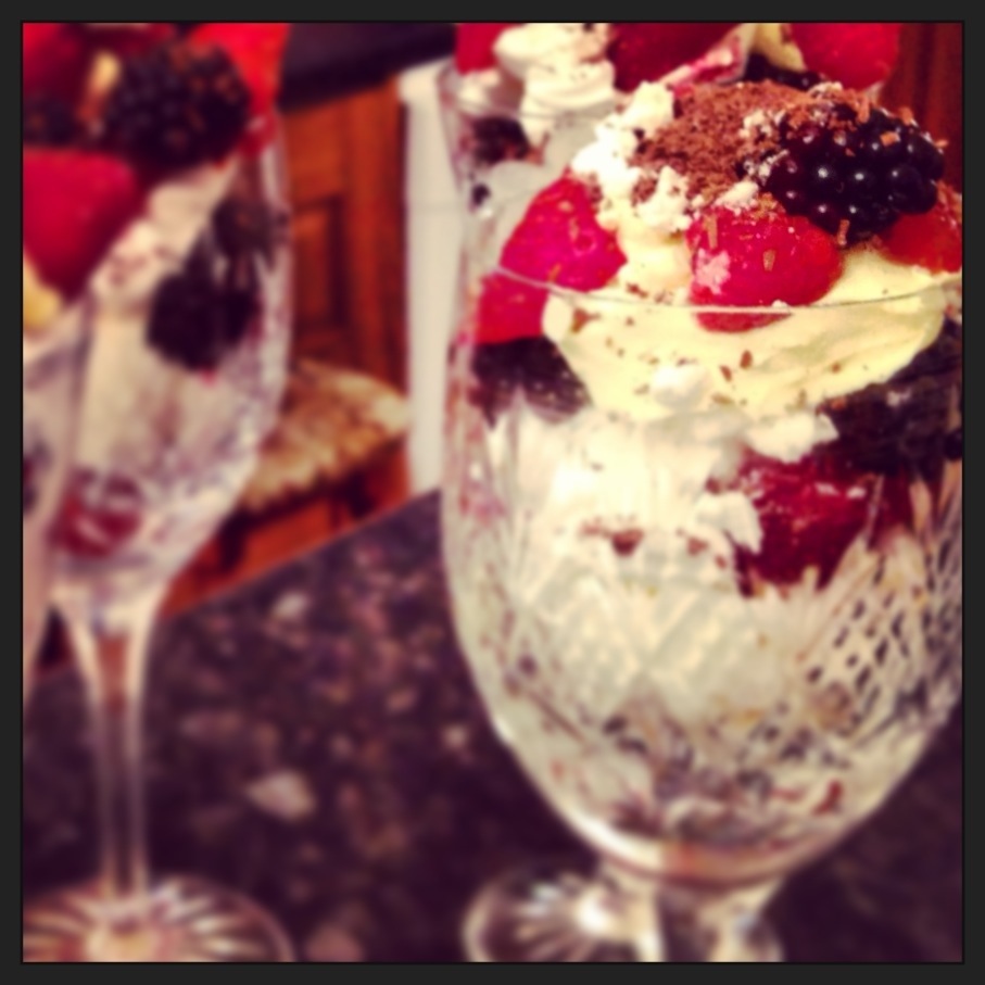 Halve the strawberries and put a small amount in the bottom of the glass, add a spoonful of double cream, layer on top raspberries and blackberries. Spoon over some yoghurt, add some crushed meringue, then layer again with strawberries, raspberries and blackberries. Top off with a generous amount of double cream, then stick more fruit on top, sprinkle some more crushed meringue over the top, then using a fine grater, grate some dark chocolate on top.