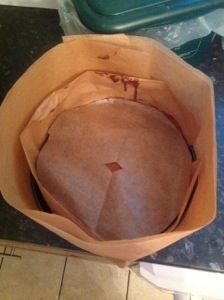 Place this wrapped up delight into the oven and set your timer for 5 hours. Now I know that seems a long time, and every oven is different, but you must think of this cake as “setting” rather than baking. It won’t rise, it will just solidify!! After 4 hours, check your cake by inserting a clean flat knife into the centre. If it comes out clean, it’s done, if not, back in the oven it goes!!