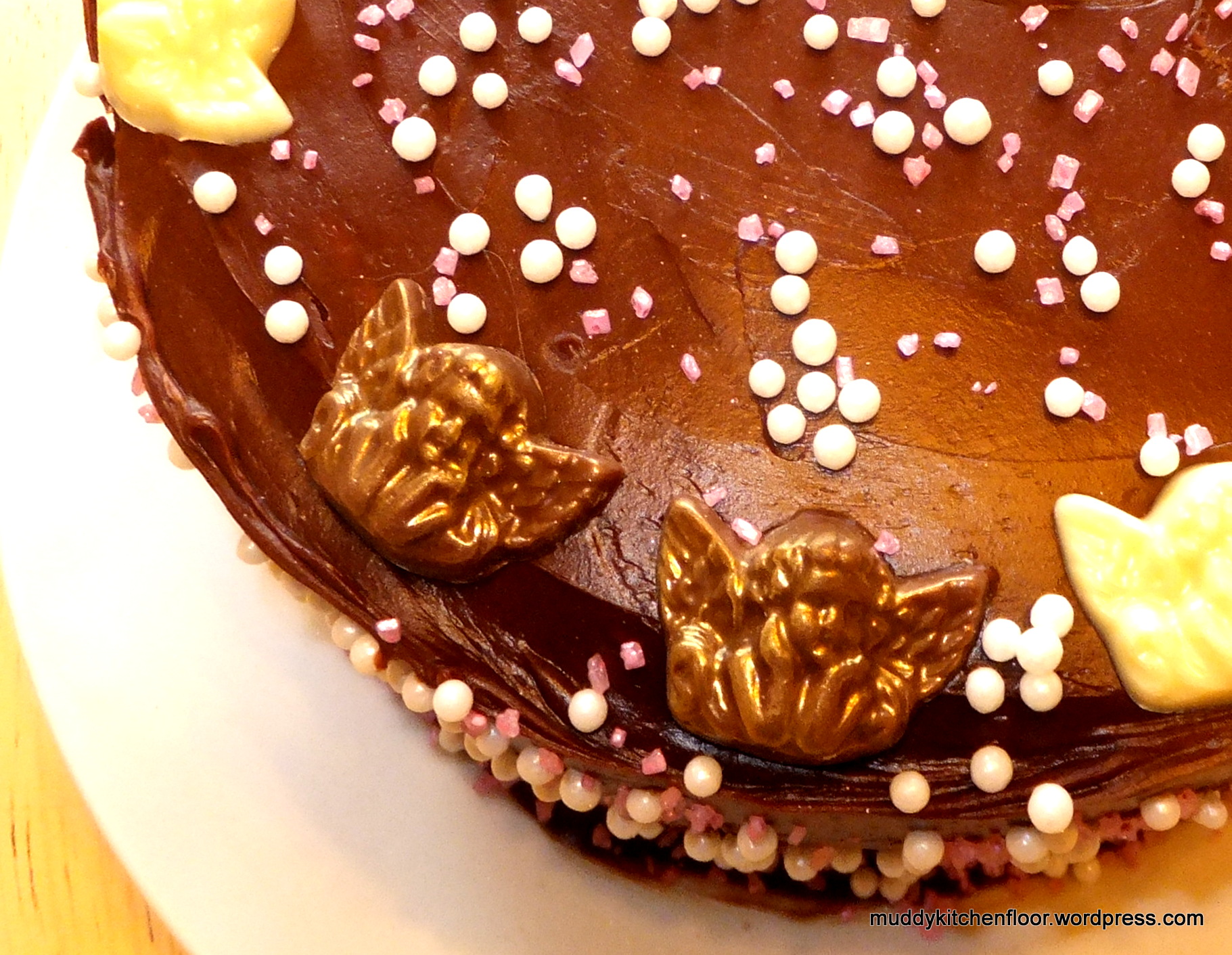 Now for the fun part, the sprinkles! I used some ready made milk and white chocolate cherubs, to decorate around the top edge of the cake, then white sugar pearls which I literally tool handfuls and sprinkled randomly on top, then “chucked” them at the side of the cake letting them hit and stick in a random pattern.