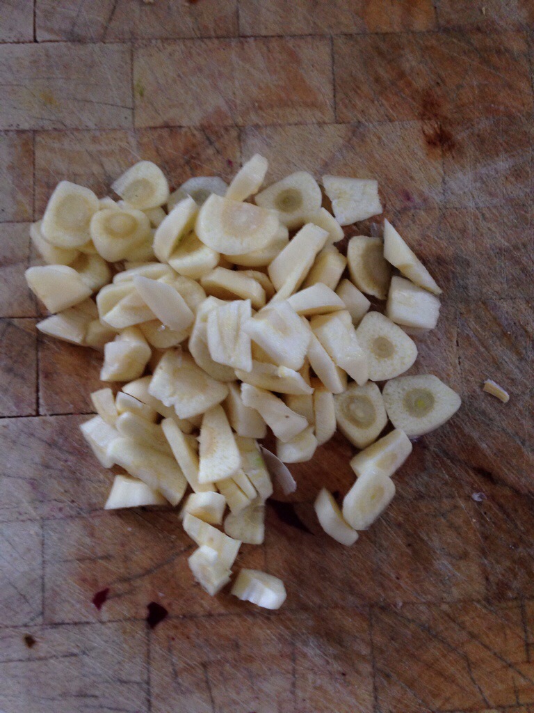 While the onions are cooking, heat up your beef stock, leave it simmering on a low low low heat, and chop your garlic into small pieces like this.