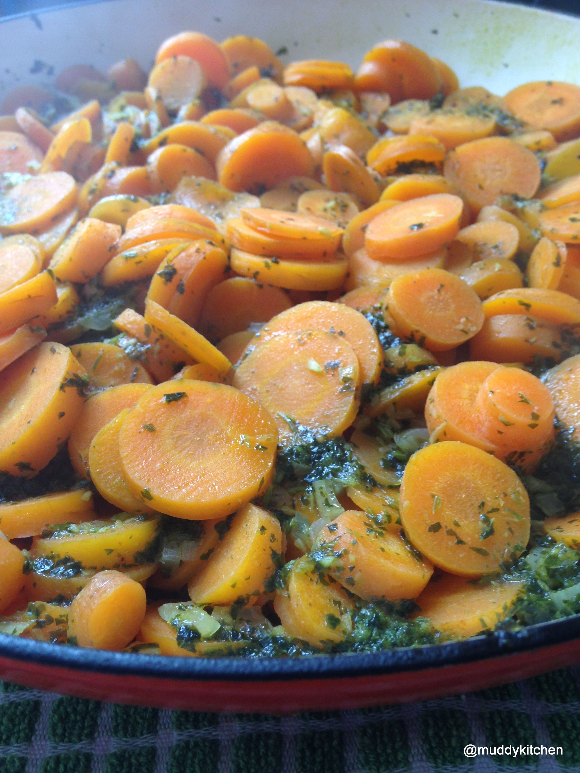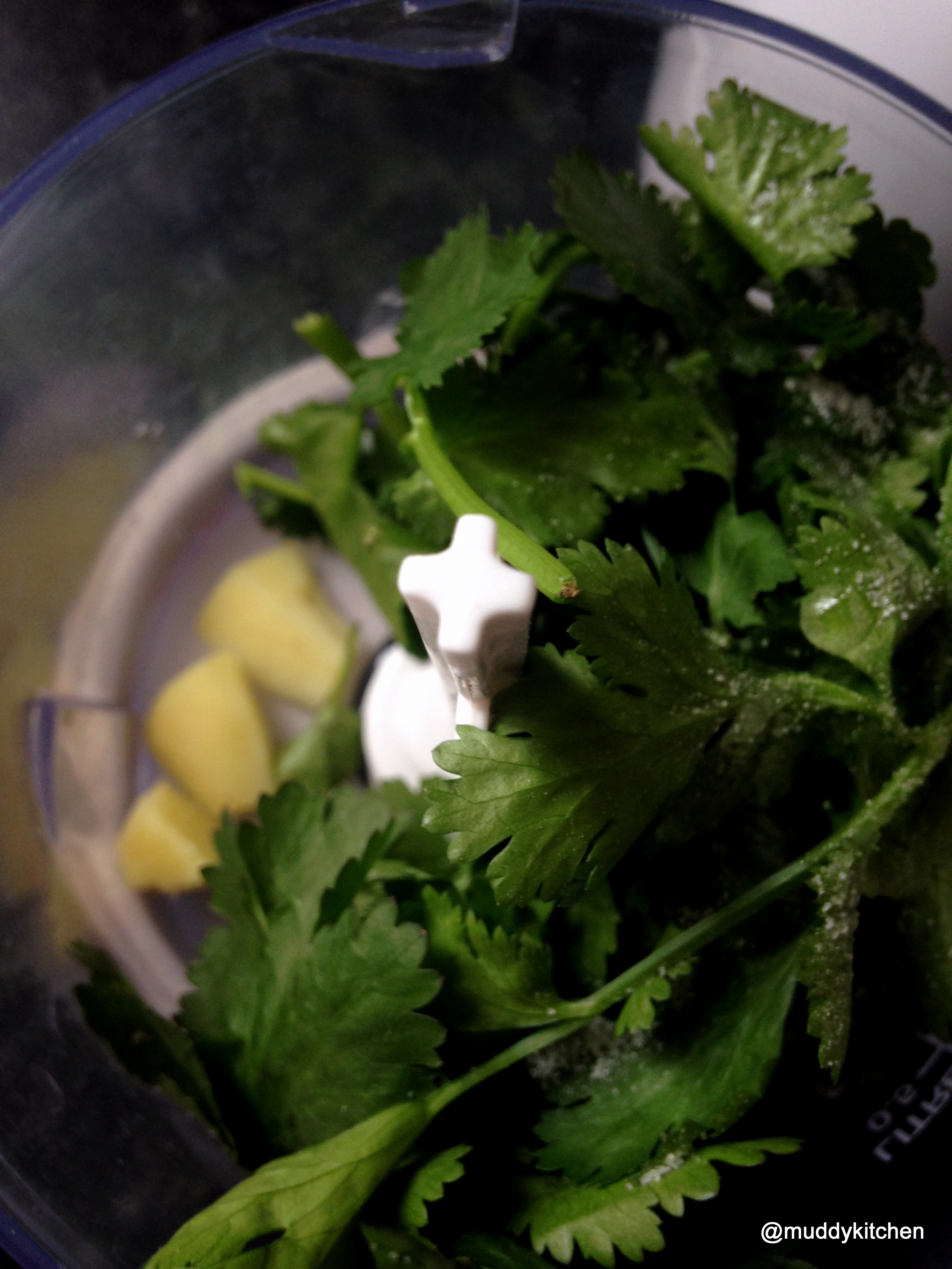 Place this onion into a cold pan, with cold oil, and set over a low heat and begin to gently cook through. While this is happening (It should take about 15 minutes – that’s how “Low Low Low” you need your heat), grab a large bunch of Coriander, about 2 inches of Fresh Peeled Ginger Root, some salt and a drizzle of Olive oil and place into a food processor, and whizz it up into a smooth(ish) green aromatic paste.