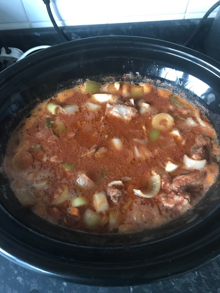 400g shallots, 1 large carrot, 1 green pepper (I don’t particularly like green peppers but slow cooked they are ok), 5 cloves of garlic (try and get smoked garlic but normal garlic is good too), 500g passata, 1/2 litre of chicken stock, 2 teaspoons paprika, 1 teaspoon of mustard powder, 1 teaspoon crushed red chillis and 8 pork steaks.