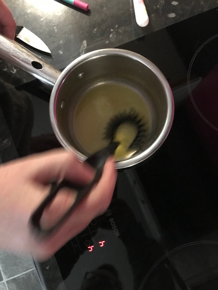 Melt the butter on a low heat until melted. Do not over cook the butter as we don’t want it going brown.