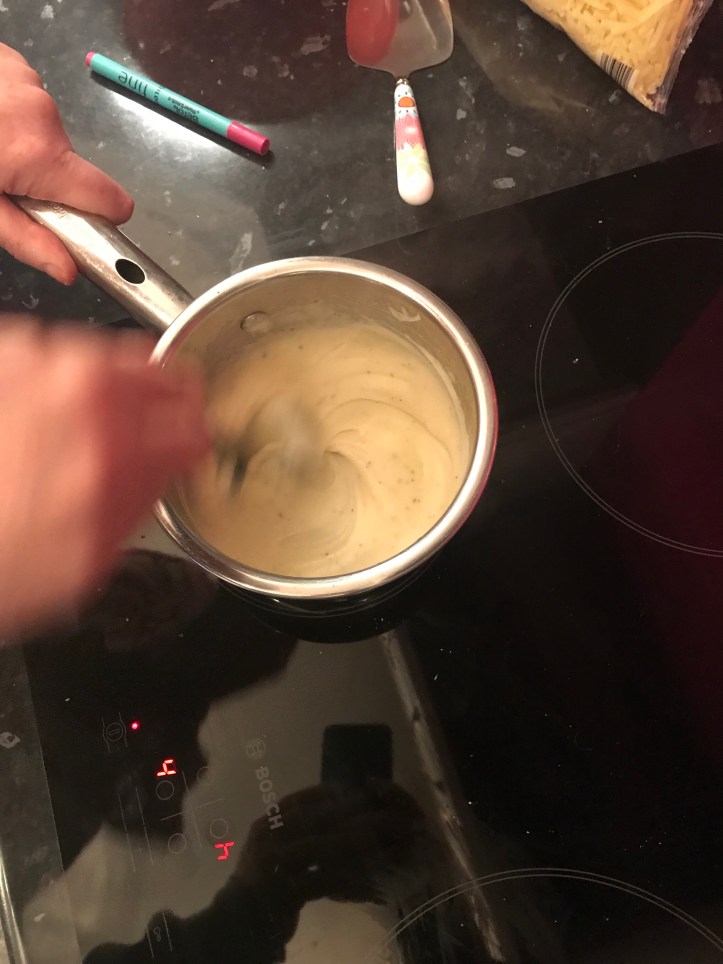 We went through the process of listening to the butter sizzle to know when the flour was cooked through, how to feel the texture (fluffy clouds) to know the base was ready for the addition of milk.